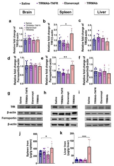 The protein levels of TfR (TfR1 in the brain and spleen, and TfR2 in the liver), the principal iron importer, and ferroportin, the major iron exporter, in the brain, spleen, and liver are shown in Figure 9. Brain levels of TfR1 (Figure 9a,g) and ferroportin (Figure 9d,g) did not differ between experimental groups. Similarly, the liver expression of TfR2 (Figure 9c,i) and ferroportin (Figure 9f,i) did not differ between experimental groups. However, chronic TfRMAb dosing significantly increased splenic TfR1 (p < 0.05; Figure 9b,h) and ferroportin (p < 0.01; Figure 9e,h) levels compared to the saline-treated mice. Chronic TfRMAb dosing also increased splenic (p < 0.05; Figure 9j) and liver (p < 0.0001; Figure 9k) iron in the aged APP/PS1 mice. TfRMAb-TNFR or etanercept dosing did not alter splenic or liver iron in the aged APP/PS1 mice.