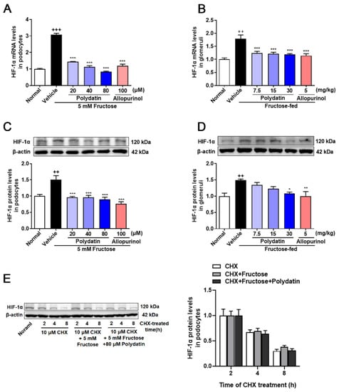 Polydatin inhibits the overexpression of HIF-1α in high fructose-cultured podocytes. (A,B) Relative mRNA levels of HIF-1α were detected in podocytes (n = 4–6) and rat glomeruli (n = 5–8) by qRT-PCR. (C,D) Relative protein levels of HIF-1α were detected in podocytes (n = 6–8) and rat glomeruli (n = 4–5) by Western blot and quantified by Image J. (E) Relative protein levels of HIF-1α were detected in podocytes stimulated with or without fructose (5 mM), polydatin (80 μM), and allopurinol (100 μM) for 12 h and then incubated 10 μM cycloheximide for 2, 4, or 8 h (n = 3) by Western blot and quantified by Image J. Protein levels were normalized to the fold of 2 h. Data are expressed as the mean ± S.E.M. ++ p < 0.01, +++ p < 0.001 compared with normal control group, * p < 0.05, ** p < 0.01, *** p < 0.001 compared with fructose vehicle group.