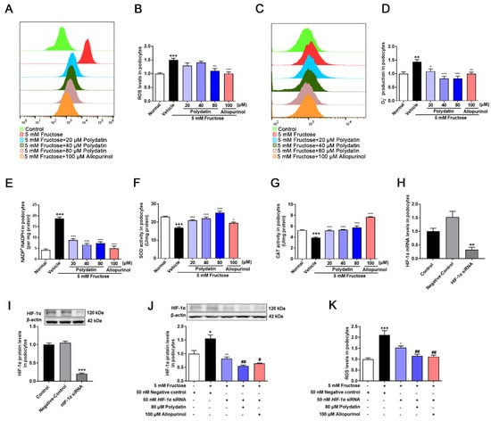 Polydatin inhibits HIF-1α to ameliorate oxidative stress in high fructose-cultured podocytes. Podocytes were cultured with or without fructose (5 mM) in the presence or absence of polydatin (20, 40, and 80 μM) or allopurinol (100 μM). (A,B) ROS levels (24 h) were analyzed by labeling fluorogenic probe DCFH2-DA, evaluated by flow cytometry (n = 3) and microplate reader (n = 5) in podocytes. (C,D) O2− levels (24 h) were measured by fluorogenic probe DHE, evaluated by flow cytometry (n = 3) and microplate reader (n = 7–10) in podocytes. (E–G) Intracellular NADP+ and NADPH levels (48 h) (n = 4) (E), SOD activity (48 h) (n = 8–12) (F), and CAT activity (48 h) (n = 6–9) (G) in podocytes were measured, respectively. (H,I) Relative mRNA and protein levels of HIF-1α in podocytes transfected with HIF-1α siRNA were detected by qRT-PCR (n = 2–3) and Western blot (n = 7–8). (J) Relative protein levels of HIF-1α were detected in podocytes transfected with HIF-1α siRNA and then incubated with or without fructose (5 mM), polydatin (80 μM), and allopurinol (100 μM) by Western blot (n = 4). (K) ROS levels were analyzed in podocytes transfected with HIF-1α siRNA and then incubated with or without fructose (5 mM), polydatin (80 μM), and allopurinol (100 μM) by labeling fluorogenic probe DCFH2-DA, evaluated by microplate reader (n = 8–10). Data are expressed as the mean ± S.E.M. + p < 0.05, ++ p < 0.01, +++ p < 0.001 compared with normal control group or negative control group, * p < 0.05, ** p < 0.01, *** p < 0.001 compared with fructose vehicle group, # p < 0.05, ## p < 0.01 compared with fructose vehicle and HIF-1α siRNA transfection group.