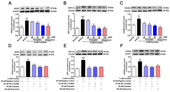 Polydatin suppresses HIF-1α/NOX4 pathway activation in fructose-cultured podocytes. (A–C) Relative protein levels of NOX4 (24 h) (n = 4–5) (A), SDF-1α (72 h) (n = 6–7) (B), and CXCR4 (72 h) (n = 4–5) (C) were detected in podocytes cultured with or without fructose (5 mM) in the presence or absence of polydatin (20, 40, and 80 μM) or allopurinol (100 μM) by Western blot and quantified by Image J. (D–F) Relative protein levels of NOX4 (48 h) (n = 6) (D), SDF-1α (48 h) (n = 5–6) (E), and CXCR4 (48 h) (n = 5–6) (F) were detected in podocytes transfected with HIF-1α siRNA and then incubated with or without fructose (5 mM), polydatin (80 μM), and allopurinol (100 μM) by Western blot and quantified by Image J. Data are expressed as the mean ± S.E.M. + p < 0.05, ++ p < 0.01, +++ p < 0.001 compared with normal control group or negative control group, * p < 0.05, ** p < 0.01, *** p < 0.001 compared with fructose vehicle group.