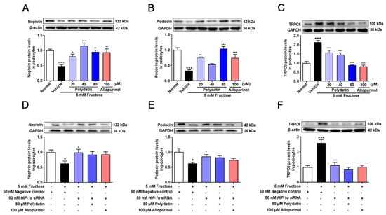 Polydatin prevents high fructose-induced podocyte structural damage. (A–C) Relative protein levels of nephrin (72 h) (n = 6) (A), podocin (72 h) (n = 5–7) (B), and TRPC6 (72 h) (n = 6) (C) were detected in podocytes cultured with or without fructose (5 mM) in the presence or absence of polydatin (20, 40, and 80 μM) or allopurinol (100 μM) by Western blot and quantified by Image J. (D–F) Relative protein levels of nephrin (48 h) (n = 4–5) (D), podocin (48 h) (n = 5) (E), and TRPC6 (48 h) (n = 5–8) (F) were detected in podocytes transfected with HIF-1α siRNA and then incubated with or without fructose (5 mM), polydatin (80 μM) and allopurinol (100 μM) by Western blot and quantified by Image J. Data are expressed as the mean ± S.E.M. + p < 0.05, +++ p < 0.001 compared with normal control group or negative control group, * p < 0.05, ** p < 0.01, *** p < 0.001 compared with fructose vehicle group.