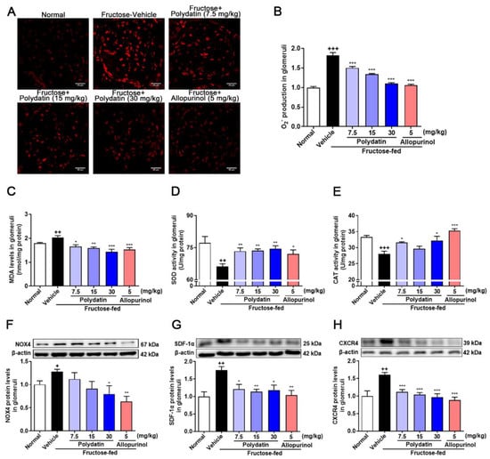 Polydatin prevents oxidative stress of glomeruli in high fructose-fed rats. Rats were fed 10% fructose water (wt/vol) for 13 weeks and treated with polydatin (7.5, 15, and 30 mg/kg) and allopurinol (5 mg/kg) for 7 weeks. (A,B) O2− levels were measured in rat glomeruli by fluorogenic probe DHE (red, scale bar = 40 μm) (n = 3) and photographed by a confocal laser scanning microscope. (C–E) MDA levels (n = 5–8) (C), SOD activity (n = 6–7) (D) and CAT activity (n = 5–7) (E) were measured in rat glomeruli respectively. (F–H) Relative protein levels of NOX4 (n = 4–6) (F), SDF-1α (n = 4–5) (G) and CXCR4 (n = 4–5) (H) were detected in rat kidney glomeruli by Western blot and quantified by Image J. Data are expressed as the mean ± S.E.M. + p < 0.05, ++ p < 0.01, +++ p < 0.001 compared with normal control group, * p < 0.05, ** p < 0.01, *** p < 0.001 compared with fructose vehicle group.