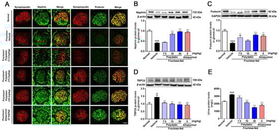 Male Sprague-Dawley rats (6–7 weeks old, 180–220 g of body weight) were purchased from the Experimental Animal Centre of Zhejiang Province (Hangzhou, China). The experimental animals were housed in the animal room of the College of Life Sciences of Nanjing University with a room temperature of 22 ± 2 °C, a humidity of 55 ± 5%, and a 12 h light/dark cycle (light from 9:00 a.m. to 9:00 p.m.). All rats were given standard chow and water (ad libitum) 7 days for acclimatization before the experiment, and then randomly divided into 6 subgroups (n = 8): normal-control, fructose-vehicle, fructose with polydatin (15721, Sigma-Aldrich, Shanghai, China) (7.5, 15, and 30 mg/kg) as well as fructose with allopurinol (A8003, Sigma-Aldrich, Shanghai, China) (positive drug, 5 mg/kg). Polydatin or allopurinol was mixed with normal saline by ultrasonic waves, and then suspended or dissolved. The rats of normal control group had standard chow and water for 13 weeks. The remaining five groups of rats were given 10% fructose (Shandong Xiwang Sugar Industry Co., Ltd., Binzhou, China) (wt/vol) water for 6 weeks, followed by the treatment with saline, polydatin, or allopurinol by intragastric gavage for the next 7 weeks, respectively, according to our previous report [5]. Allopurinol, as an effective xanthine oxidase (XO) inhibitor, reduces serum uric acid levels and slows down the progression of renal disease in patients with chronic kidney disease [26,27]. Our previous study showed that allopurinol protected against high fructose-induced apoptosis in rats and cultured podocytes [28]. Therefore, allopurinol was used as a positive drug to evaluate the effect of polydatin on high fructose-induced podocyte injury in this study. All drugs were administered once daily at 2:30–3:30 p.m. Doses of polydatin [5,29,30] and allopurinol [28,31,32] were selected based on our previous studies and other reports. Body weight was recorded weekly throughout the experiment. At week 12, each rat was placed in a metabolic cage to collect 24-h urine, respectively. Urine samples were centrifuged at 3000× g for 10 min at 4 °C to remove particulate contaminants and stored at −80 °C. Animal welfare and experimental procedures were carried out following the criteria outlined in the Guide for the Care and Use of Laboratory Animals enacted by the National Academy of Sciences and published by the National Institutes of Health (NIH publication 86-23 revised 1985) and the related ethnical regulations of Nanjing University [SYXK (SU) 2009-0017]. All efforts were made to minimize animals’ suffering and to reduce the number of animals used.