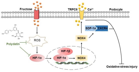 In this study, we demonstrated that high-fructose-increased HIF-1α expression exacerbated redox status imbalance and podocyte damage by promoting NOX4 to activate SDF-1α/CXCR4 axis. Polydatin restrained HIF-1α expression to inhibit NOX4 and suppressed SDF-1α/CXCR4 axis activation, resulting in the attenuation of high fructose-induced oxidative stress damage of glomerular podocytes.