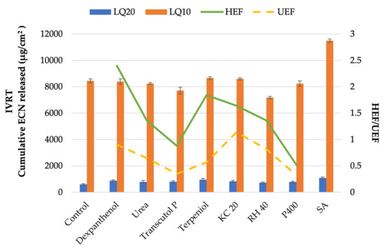 Comparative analysis of lacquers containing 10% w/w polymer (LQ10) and 20 % w/w polymer (LQ20) with different permeation enhancers, showing cumulative amount of econazole nitrate released on the primary Y-axis, and hydration efficiency factor (HEF) and drug uptake enhancement factor (UEF) on the secondary Y-axis. The bars represent the cumulative drug release from in vitro release tests (IVRT), solid and broken lines represent the HEF and UEF values, respectively.