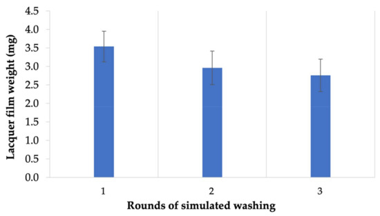 Mean lacquer film weights after each round of simulated handwashing ± SD (n = 5), a novel approach to realistically test nail lacquers for patient use.