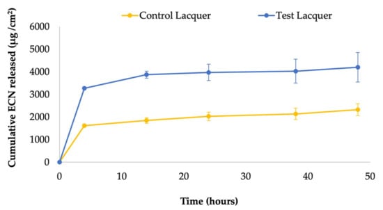 In vitro drug release studies showing cumulative amount of econazole nitrate released from the test and control lacquers across a unit area of the permeation membrane over time, reported as mean ± SD; n = 4 for test lacquer and n = 3 for control lacquer.