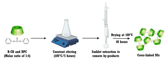 NSs were synthesized with minor modifications from previously reported methods [10,43], using β-CD and diphenyl carbonate (DPC) as precursors. Anhydrous β-CD (1.5 g) and DPC (0.856 g) were homogenized in a solid state, placed in a conical flask, and heated from 90 to 100 °C under constant stirring for 5 h. The reaction mixture was left at room temperature until it cooled down, and the obtained solid was ground with an agate mortar. Double distilled water and acetone separated the product from the unreacted precursors. Afterward, the solid was washed with Soxhlet extraction with ethanol and acetone for 48 h to remove phenol, which formed as a by-product of the cross-linking reaction. Finally, the solid was dried at 100 °C for 48 h and stored at room temperature for further use. Figure 2 illustrates the synthetic route of NSs.
