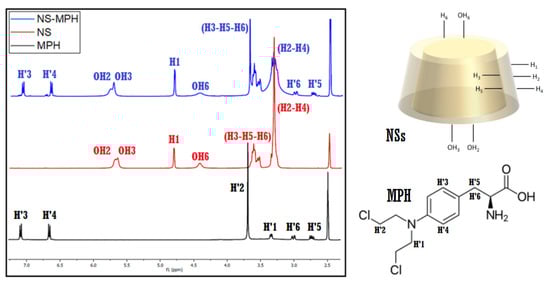 1H-NMR spectra (400 MHz, DMSO-d6) of MPH, NSs, and NSs–MPH.
