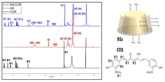 The inclusion of MPH and CUR inside the cavities of the NSs was confirmed using 1H-NMR spectroscopy. The changes in the chemical shifts in the protons of both NSs and the drugs provided evidence for the formation of the NSs–MPH and NSs–CUR complexes. The acquired spectra of NSs, MPH, CUR, and the ICs are shown in Figure 3 (adapted from [36]) and Figure 4.