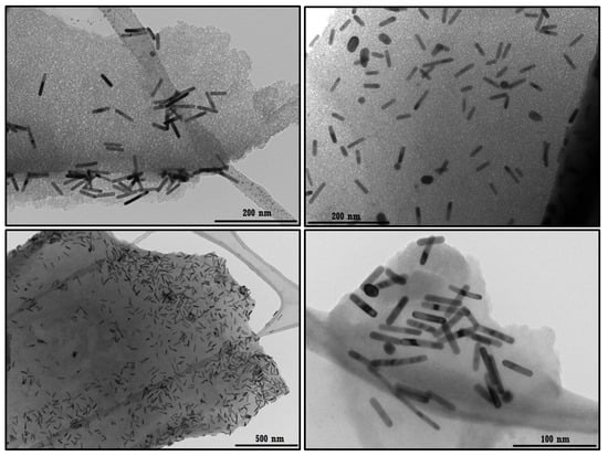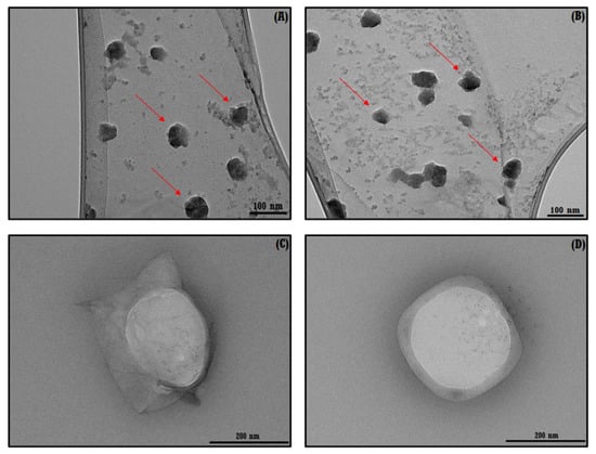 TEM images of NSs (A,B), NSs–MPH (C), and NSs–CUR (D). The red arrows (A,B) highlight some of the synthesized NSs.