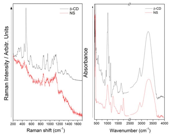 Raman (left) and FT-IR spectra (right) of β-CD and NSs.
