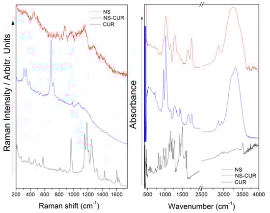Raman (left) and FT-IR spectra (right) of NSs, CUR and NSs–CUR.