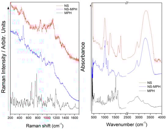 Raman (left) and FT-IR spectra (right) of NSs, MPH and NSs–MPH.