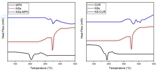 The NSs–MPH and NSs–CUR complexes were characterized through DSC. Thermal analyses of NSs, the ICs, and the free drugs were performed to confirm the formation of an inclusion compound between the guests and the NSs matrix rather than a physical mixture. Figure 10 depicts the thermograms of MPH, CUR, NSs, NSs–MPH, and NSs–CUR. NSs exhibit an endothermic peak at 350 °C, representing the melting point of the crosslinked polymer, as reported previously [43,58,59]. DSC thermogram of MPH shows a sharp endothermic peak at around 203 °C, corresponding to the melting point of the free drug [60].