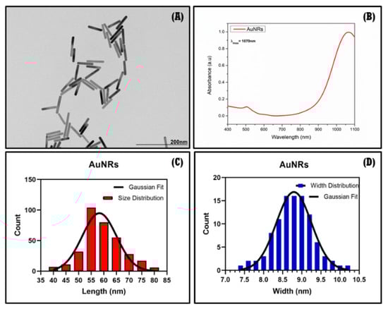The characterization of AuNRs was carried out by TEM, UV-Vis, DLS and ζ-potential. Figure 11A shows the TEM micrograph of the AuNRs, and its size distribution was estimated. Both the length and width of the nanoparticles were plotted (Figure 11C,D) and their average sizes were 55 nm and 8.6 nm, respectively. The UV-Vis spectra of AuNRs confirmed the presence of its characteristic plasmon band in the NIR-II window, showing a maximum absorbance for the longitudinal plasmon at 1070 nm (Figure 11B), making them suitable for biological and photothermal applications [67]. The aspect ratio (length/width) for the synthesized AuNRs was 6.4. This agrees with the reported values, which indicate that AuNRs absorb in the second biological window [42,68,69].