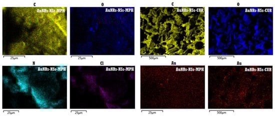 The loading capacity (LC) of NSs–MPH and NSs–CUR was obtained from the total weight of NSs and the weight of entrapped drugs using Equation (2):