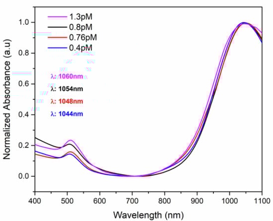 UV-Visible spectra of the AuNRs and the ICs associated with AuNRs were measured using a Jasco V-760 UV-Visible spectrometer. Measurements were conducted in the range of 200–1100 nm, using deionized water as a reference. The UVProve 1.10 program was used for data processing.