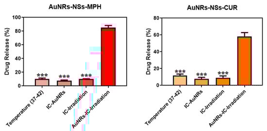 For laser irradiation assays, a laser at 1064 nm, with a light power of 150 mW and beam diameter of 1 mm, was used. A total of 200 µL of the NSs–MPH and NSs–CUR complexes conjugated with the AuNRs were added to a 500 µL Kahn test tube. The ternary systems were exposed to laser irradiation at different times (intervals of 1 min until reaching a maximum of 20 min). The release of both MPH and CUR was measured using UV-Vis spectroscopy. ICs without AuNRs were irradiated for control assays to determine whether the AuNRs were responsible for the release of the guest molecules.