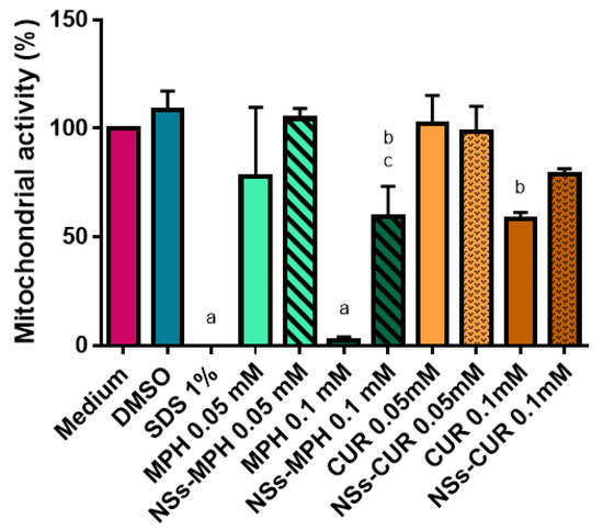 Mitochondrial activity was measured by MTS using the CellTiter 96 AQueous one solution cell proliferation assay (Promega). The experiments were conducted as recommended by the manufacturer. In brief, 5000 cells per well were seeded on 96-well plates in 100 µL of complete Dulbecco’s Modified Eagle Medium (DMEM). The medium was incubated at 37 °C and was subsequently removed after 1 day. Further, cells were incubated for another day with a titration (1 to 1 serial dilutions) of MPH, CUR, NSs–MPH, and NSs–CUR (all samples ranging from 0.1, 0.05, 0.025, and 0.01 mM in 1% DMSO, and then the volume was completed with DMEM medium). Afterward, phenol red-free DMEM medium (Gibco) containing the MTS/PMS reagent was added to replace the medium and incubated for 1 h at 37 °C. Absorbance measurements of all samples were carried out with a microplate reader at 490/655 nm (Synergy Mx, Biotek). For each experiment, fluorescence was corrected by subtracting the average fluorescence from a triplicate set of control wells without cells. Mitochondrial activity was calculated with respect to a non-treated control (medium). Each experiment was performed in 3 technical and 2 biological replicates.
