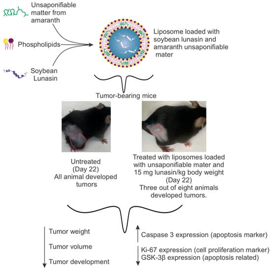 Castañeda-Reyes ED, Perea-Flores MdJ, Dávila-Ortiz G, Gonzalez de Mejia E. Liposomes Loaded with Amaranth Unsaponifiable Matter and Soybean Lunasin Prevented Melanoma Tumor Development Overexpressing Caspase-3 in an In Vivo Model. Pharmaceutics. 2022; 14(10):2214. https://doi.org/10.3390/pharmaceutics14102214