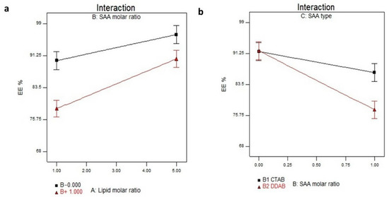 (a) Interaction plot for the effect of lipid molar ratio (X1) and cationic SAA molar ratio (X2) on EE%. (b) Interaction plot for the effect of and cationic SAA molar ratio (X2) and cationic SAA type (X3) on EE%. Abbreviation: SAA, surfactant; EE%, entrapment efficiency percent.