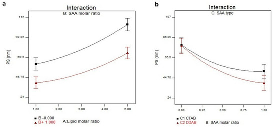(a) Interaction plot for the effect of lipid molar ratio (X1) and cationic SAA molar ratio (X2) on PS. (b) Interaction plot for the effect of and cationic SAA molar ratio (X2) and cationic SAA type (X3) on PS. Abbreviation: SAA, surfactant; PS, particle size.
