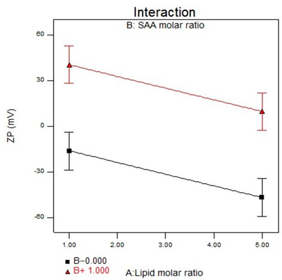 Interaction plot for the effect of lipid molar ratio (X1) and cationic SAA molar ratio (X2) on ZP. Abbreviation: SAA, surfactant; ZP, zetapotential.