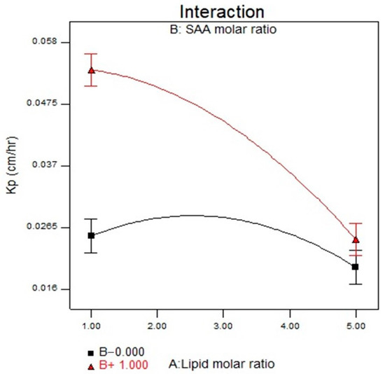 Interaction plot for the effect of lipid molar ratio (X1) and cationic SAA molar ratio (X2) on Kp. Abbreviation: SAA, surfactant; Kp, permeability coefficient.