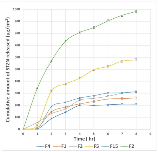 Figure 5 shows the in vitro release profiles of LP formulae (F4, F1, and F15) with lipid-to-SAA molar ratios or 5:0, 3:0, and 1:0, respectively (LP formulae composed of SPC only) and their comparable formulae (F3, F5, and F2) with lipid-to-SAA molar ratios 5:1, 3:1, and 1:1, respectively. The in vitro release profiles in all formulae composed of SPC alone were characterized by an initial burst release followed by a sustained release. Burst release occurred due to the presence of some of the STZN on the external surface of the LP. The lipophilic nature of the STZN could be the reason for the sustained release of the drug from the internal lipid phase after the initial burst release. On the contrary, for the formulae composed of SPC and SAA, the in vitro release profiles are characterized by an increased rate of initial burst release with diminishing the sustained release period, especially for the LP formula with a low lipid molar ratio (F2). This might be due to the lipid’s solubilization by SAA. LP formula F2 (composed of 1:1 SPC to DDAB) exhibited the highest cumulative amount of STZN released among the previously mentioned LP formulae; this enhancement might be due to the reduced PS (24.18 ± 0.11 nm); that created a high surface area or the low lipid molar ratio together with lipid solubilization effect of SAA decreasing the rigidity of the vesicle. The regression coefficient values indicated that the in vitro release profile of all LP formulae could best be fitted using the Higuchi release model.