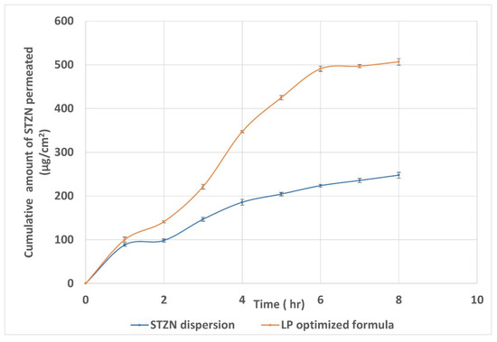 Cumulative amount of STZN permeated from the optimized LP formula and aqueous dispersion. Abbreviations: STZN, sertaconazole nitrate; LP, leciplex.