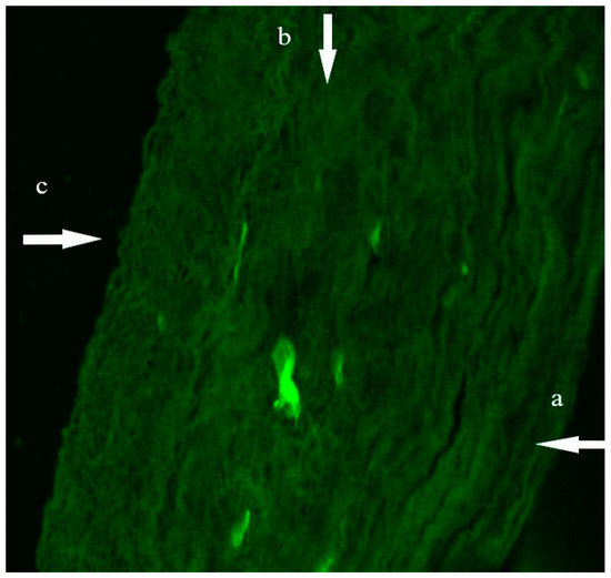 A tile scan confocal laser microscope photomicrograph of a longitudinal section in cow cornea treated with FDA-loaded LPs; a, epithelium; b, stroma; c, endothelium. Abbreviations: FDA, fluorescein diacetate; LPs, leciplex.