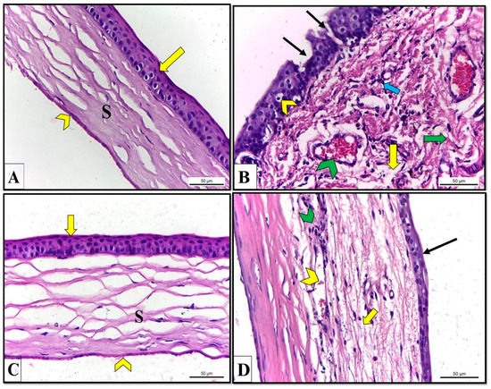 A histopathological study was conducted to evaluate the efficacy of STZN-loaded LP compared to aqueous drug dispersion. Histological examination of H&E-stained sections of the cornea of the control albino rat (GP I) showed a normal histological structure of stratified squamous epithelium, stroma, and endothelium (Figure 10A). However, corneal sections obtained from untreated rats (GP II) revealed numerous structural alterations compared to control rats (GP I), including increased corneal thickness and decreased stratified squamous epithelium portions. In addition, some epithelial cells had vacuolated cytoplasm. Furthermore, the stroma had dispersed collagen fibers, proliferating inflammatory cells, edema, and dilated blood capillaries engorged with blood (Figure 10B).