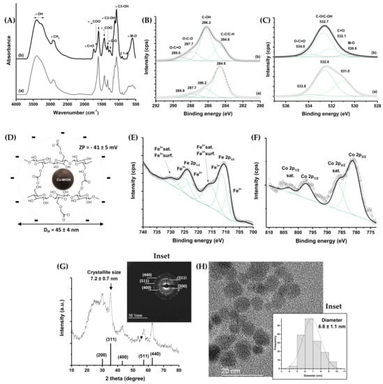Characterization of Co-MION@CMC: (A) FTIR and HR-XPS spectra, and (B) C 1s and (C) O 1s regions, were obtained from (a) CMC polymer and (b) Co-MION@CMC nanostructure. (D) Schematic representation of the supramolecular structure of the nanosystem, with ZP and DH information. HR-XPS spectra of the (E) Fe 2p and (F) Co 2p regions. (G) XRD pattern with diffraction planes compared to magnetite’s ICCD file (inset: SAED diffraction lines). (H) TEM image (inset: histogram of size distribution).