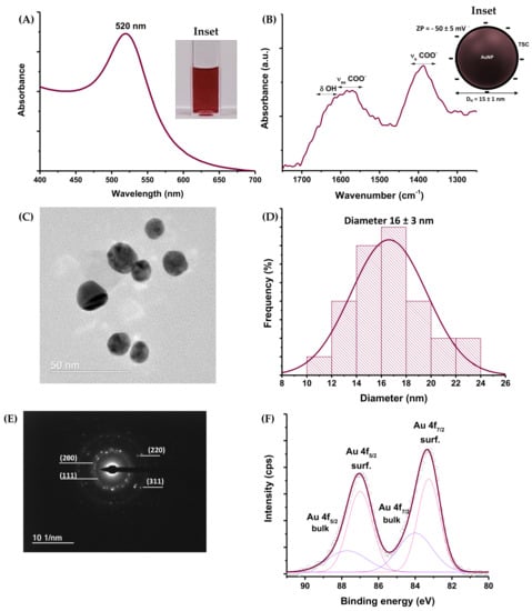 The FTIR spectrum of TSC-capped AuNPs is presented in Figure 3B. It indicates peaks of the νas COO− (1605–1555 cm−1) and νs COO− (1405–1370 cm−1), which are characteristic of citrate species in TSC-stabilized gold nanoparticles. The broadening of the band of asymmetric carboxylate vibration at higher wavenumbers is associated with the bending vibrations of adsorbed water (δ OH) on metal surfaces, usually detected in the range of 1650–1610 cm−1 [39]. Regarding the colloidal physicochemical properties, the DH was evaluated as 15 ± 1 nm, with a PDI of 0.250. A zeta potential value of −50 ± 5 mV indicated that electrostatic forces effectively stabilized the AuNPs due to the repulsion between anionic charges from COO− groups from citrate (ZP < −30 mV) (inset in Figure 3B). The TEM image (Figure 3C) indicated that the AuNPs presented a spherical shape and monodispersed size distribution (PDI = 0.035) centered at 16 ± 3 nm (Figure 3D), consistent with the size measured by DLS. This was expected, considering that the diameter obtained by laser scattering for TSC-AuNPs is usually similar to that obtained by TEM, due to the low contribution of the small molecules in the organic layer. The crystalline nature and composition of the nanoparticles were verified by SAED (Figure 3E). The concentric diffraction rings corresponded to interplanar distances of 2.4 ± 0.1 Å, 2.0 ± 0.1 Å, 1.4 ± 0.1 Å, and 1.2 ± 0.1 Å, which were indexed as the (111), (200), (220), and (311) planes of the face-centered cubic (FCC) nanostructure of Au0 (ICDD file 04-0784), respectively. HR-XPS analysis (Figure 3F) also confirmed the absence of Au3+ species and the formation of metallic gold. The Au 4f region (Au 4f7/2 and Au 4f5/2) was deconvoluted into two peaks compatible with low-coordinate Au0 species at the surface (83.3 eV and 87.0 eV) and bulk Au0 (84.0 eV and 87.7 eV) [40].