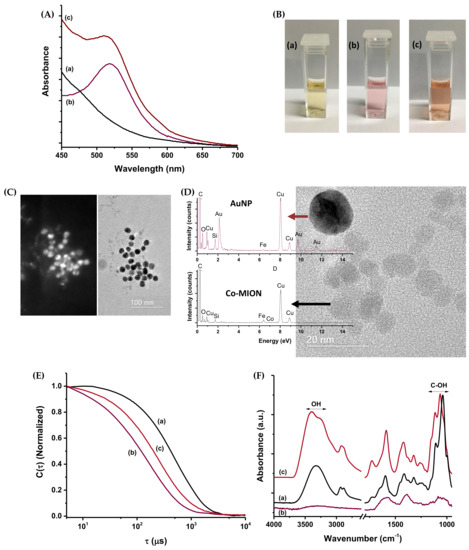 The FTIR spectrum of the AuNPs (Figure 4F(b) and Figure 3B) demonstrated the citrate groups used as chemical reductants and stabilizing agents for gold nanoparticles. The spectrum of Co-doped magnetite presented the main groups of the CMC polymer (Figure 4F(a) and Figure 2A). Upon combining both nanozymes (Figure 4F(c)), a significant change was detected in the vibrations of bands associated with hydroxyl groups/hydrogen bonds, indicating the change in the supramolecular structure of the polymer in the nanoassembly.