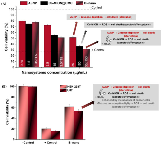 When considering the effect of cell type (Figure 7B), the results evidenced relatively higher cytotoxicity of the dual nanozymes (AuNP//Co-MION@CMC) towards cancer cells (U87) compared to healthy cells (Δ~15%). It should be stressed that this result indicates specificity toward killing tumor cells as opposed to healthy cells, which is a vital feature of nanomedicines for prospective applications in cancer theranostics. As discussed in the previous section with respect to the ROS bioassay, this specificity can be mainly credited to the different metabolic activities and pathways of cancerous cells, which are more intense than those of normal cells. Because glucose consumption—as the primary energy source (i.e., “biofuel”) and the substrate molecule of the AuNP nanozyme catalyst—is intensified by cancer cells, it generates higher intracellular stress of toxic species, boosting cell death.