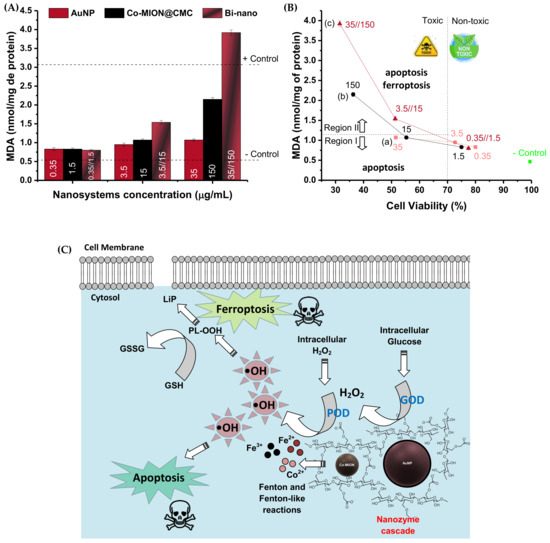 (A) Results of lipid peroxidation assessed by malondialdehyde (MDA) levels. (B) Comparison of MTT and MDA results for evaluating toxicity mechanisms ((a) AuNP, (b) Co-MION@CMC, and (c) Bi-nano). (C) Schematic representation of cell death pathways/mechanisms (e.g., apoptosis and ferroptosis) provoked by nanozyme cascade reactions.