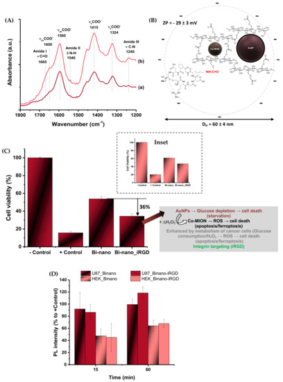 As active targeting is crucial in cancer therapy, the iRGD targeting peptide (Cys-Arg-Gly-Asp-Lys-Gly-Pro-Asp-Cys; disulfide bridge: Cys1-Cys9) was grafted to the nanoassemblies to improve their selectivity towards brain cancer cells. In addition, iRGD has been demonstrated to promote the effective transportation of nanostructures through the blood–brain barrier (BBB), which is vital for the success of brain cancer therapy [51]. Thus, it was conjugated to the dual-nanozyme supramolecular nanosystems using EDC chemistry. EDC is a water-soluble, “zero-length” crosslinker that is not incorporated into the conjugated structure by the chemical reaction; therefore, there are no concerns about its toxicity compared to other crosslinkers (e.g., glutaraldehyde, formaldehyde, epichlorohydrin) [52]. Thus, the biofunctionalized AuNP//Co-MION@CMC-iRGD (Bi-nano_iRGD) colloidal water-dispersible nanoassemblies were extensively characterized and verified for targeting brain cancer cells under a multiple-therapy approach.