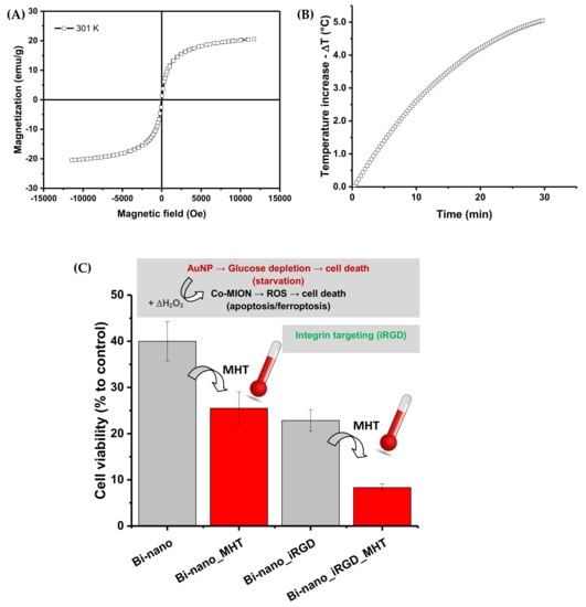 (A) Magnetization versus magnetic field at room temperature (300 K). (B) Heating curve induced by magnetic hyperthermia experiments (∆T = 5.2 °C) associated with Co-MION@CMC nanoparticles. (C) Cell viability response of U87 brain cancer cells after incubation with Bi-nano and Bi-nano_iRGD for evaluation of the combined effects of magnetic hyperthermal therapy and chemodynamic biocatalytic therapy (+ Control: 10.3 ± 1.4 %; - Control: 98.8 ± 2.5 %; -Control + MHT: > 90%).
