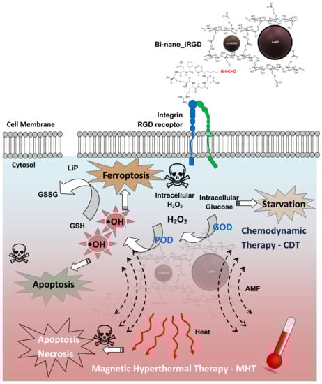 Thus, by designing and constructing nanohybrids, one can amalgamate the advantages of polymer–peptide (i.e., soft matter) conjugates for targeting cancer cells with nanozymes (i.e., hard matter) to promote ROS generation and temperature increase by an alternated magnetic field, inducing cancer cell death pathways [19,22]. In this view, by adopting a similar approach by coupling two or more nanozymes in a sequence of catalytic cascade reactions, one can offer unlimited opportunities to create hybrid nanomedicine platforms with multiple stimulus-responsive structures for fighting against cancer [22,23,24,25,27].