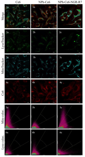 Colocalization analysis of chlorin e6 in the HT-1080 cell line, where: (a) Ce6, (b) NPh-Ce6, (c) NPh-Ce6-NGR-R7 and corresponding channels (1) Merge image, (2) LysoTrackerTM Green DND-26, (3) MitoTracker™ Red CMXRos, (4) chlorin e6 compositions, (5) Mito colocalization, (6) Lyso colocalization. Scale—20 µm.