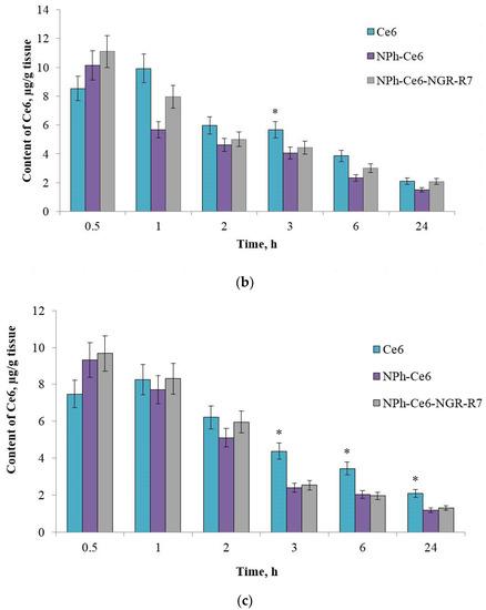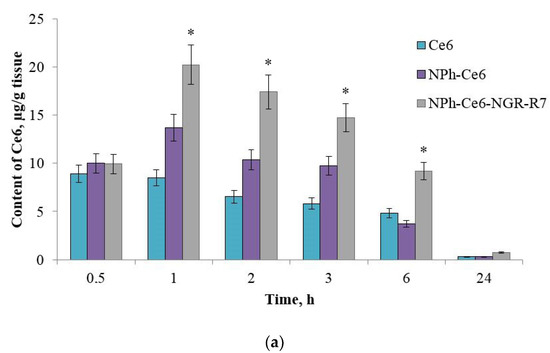 After administration using the phospholipid delivery systems NPh-Ce6-NGR-R7 and NPh-Ce6, the concentrations were 11 µg/g of liver tissue and 10.3 µg/g of liver tissue, respectively, and 9.5 µg/g of kidney tissue and 9.1 µg/g of kidney tissue, respectively. For free Ce6 substance, the maximum values were obtained at 1 h, being 10 µg/g of liver tissue and 8.6 µg/g of kidney tissue. At 24 h, the Ce6 levels in the liver were almost the same for NPh-Ce6-NGR-R7 and free substance. In the kidneys, the 24 h content was almost two times higher with free Ce6 than with embedded Ce6 (NPh-Ce6-NGR-R7 and NPh-Ce6).