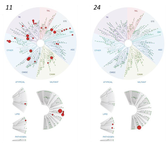 The TREEspotTM interaction map of 11 and 24 assayed at 1000 nM in the 468-kinase scanMAXSM panel. The panel includes 403 unique wild-type kinases and 59 mutant isoforms. Note that PERK is not included in the TREEspot assay but was evaluated in separate biochemical assays. Complete tabulated results presented in Supplemental Table S2.