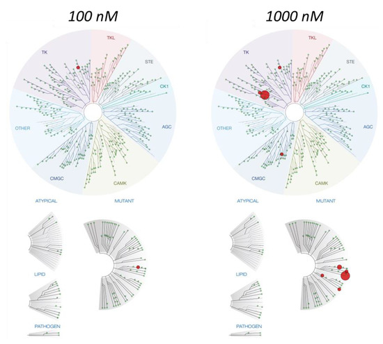 - Fabian, M.A.; Biggs, W.H., III; Treiber, D.K.; Atteridge, C.E.; Azimioara, M.D.; Benedetti, M.G.; Carter, T.A.; Ciceri, P.; Edeen, P.T.; Floyd, M.; et al. A small molecule–kinase interaction map for clinical kinase inhibitors. Nat. Biotechnol. 2005, 23, 329–336. [Google Scholar] [CrossRef]