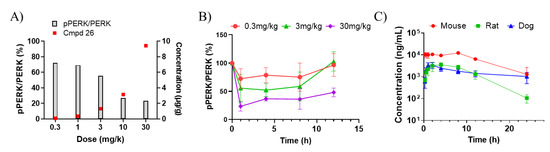 To understand the effect of 26 in target organs, the PK/PD relationship of 26 was investigated in mouse pancreas. PK analysis of plasma and pancreas samples from mice treated with 26 revealed dose-proportionate exposure at doses ranging from 0.3 to 30 mg/kg following a single administration by oral gavage (Supplemental Figure S2). Pancreas tissue was sampled to evaluate the effect of 26 on PERK autophosphorylation in pancreas, following oral administration of 26 at 0.3, 1, 3, 10, and 30 mg/kg. At 1 h following administration, phosphoPERK (T980), relative to total PERK protein (pPERK/PERK) decreased in a dose-dependent manner, reaching approximately 80% inhibition at 30 mg/kg (Figure 5A). When PERK inhibition was evaluated across time in mouse pancreas, a dose-dependent inhibition was observed which was relatively stable across a 12 h period following administration of 26 (Figure 5B). This observation was consistent with the dose-proportionate exposure and low clearance rate of 26 observed in both mouse plasma and pancreas (Supplemental Figure S2). To confirm that the PK profile of 26 in other species was suitable to enable further development, plasma concentration of 26 was quantified in mouse, rat and dog following a single oral administration at 10 mg/kg. Consistent with observations in mice, rat and dog both shared similar clearance rates as mouse, albeit with different exposure levels following administration (Figure 5C).