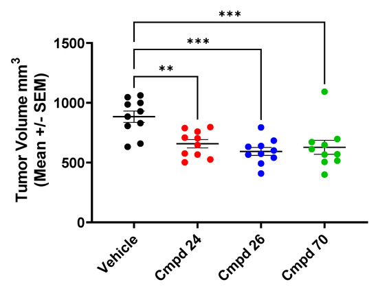 PERK inhibitors 24, 26 and 70 inhibit tumor growth of 786-O RCC xenografts. Animals were treated at 30 mg/kg BID dosing for 29 days. Statistical analysis of group means by one-way ANOVA (** p < 0.01, *** p < 0.001).