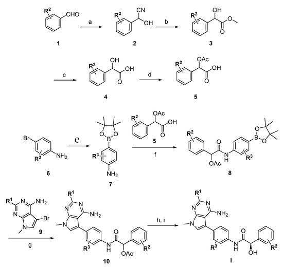 General synthesis of PERK inhibitors. Reaction conditions: (a) TMS-CN (1.2 equiv.), Znl2 (0.1 equiv.), 0 °C; (b) 3M HCl in MeOH, 0 °C to rt, 60–80% over two steps; (c) LiOH•H2O (1.2 equiv.), THF, H2O, MeOH, rt, 50–85%; (d) AcCl (2 vol.), 0 °C to rt, 70–85%; (e) B2pin2 (1.2 equiv.), KOAc (3 equiv.), PdCl2 (PPh3) 2 (5 mol. %), NEt3 (10 vol.), 90 °C, 50–70%; (f) 5 (1.2 equiv.), 50% propylphosphonic anhydride (T3P) in EtOAc (1.5 equiv.), DIPEA (3 equiv.), CH2Cl2, 0 °C to rt, 50–80%; (g) XPhos-Pd-G2 (10 mol. %), K2CO3 (3 equiv.), THF, H2O, 80 °C, 25–70%; (h) K2CO3 (2 equiv.), MeOH, rt, 80–90%; (i) Chiral SFC separation.
