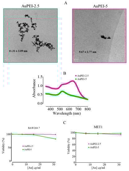 To obtain the AuPEI nanocomposites, we followed a one-pot synthesis method [47] where 0.5 mg/mL Au3+ solution (prepared from HAuCl4·3H2O salt) was mixed thoroughly with polyethyleneimine (PEI) for a final [PEI]: [Au] ratio of 2.5 and 5 (Figure 1A). The as-synthesized nanocomposites were directly dispersed in milliQ water. This one-pot synthesis is based on the weak reducing potential of amine residues present in the polymer. AuPEI nanocomposites produced at [PEI]:[Au] ratios of 2.5 (AuPEI-2.5) and 5 (AuPEI-5) showed a gold nanoparticle core diameter of 11.3 and 9.7 nm, respectively, as measured by cryogenic transmission electron microscopy (cryo-TEM) (Figure 1A), and arrangement into clusters as described in detail in [50]. One-year-old AuPEI exhibited the canonical localized surface plasmon resonance (LSPR) band around 525 nm corresponding to the transversal mode; nonetheless, AuPEI-2.5 also displayed a secondary longitudinal LSPR band, suggesting a plasmon coupling phenomenon most likely due to the closeness of nanoparticles in the fractal-like clusters (Figure 1B). Importantly, we did not detect significant cell toxicity at lower AuPEI concentrations (<30 µg/mL) (Figure 1C), both in the mouse RAW264.7 macrophage cell line and in MET-1 tumor cells.