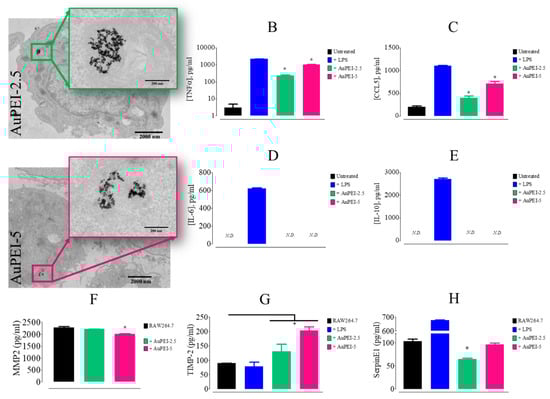 AuPEI nanocomposite effects on murine macrophage activation status. (A) TEM imaging of RAW264.7 cells incubated with 5 µg/mL AuPEI nanocomposites for 24 h. Supernatant level of secreted (B) TNFα, (C) CCL5, (D) IL-10, (E) IL-6, (F) MMP2, (G) TIMP-2, and (H) SerpinE1. (n = 6; * p < 0.05 Mann–Whitney test, 95% confidence).